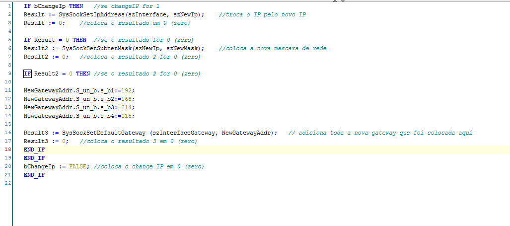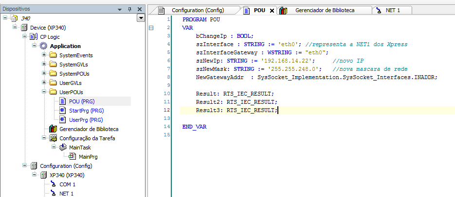 In this example, when bChangeIp becomes TRUE, the ‘eth0’ interface (which represents NET1 of Xpress) will receive the IP, mask, and gateway settings. The functions are called in sequence, conditioned to their returns (Result, Result2, and Result3) because when zero, they indicate that the functions were executed successfully.