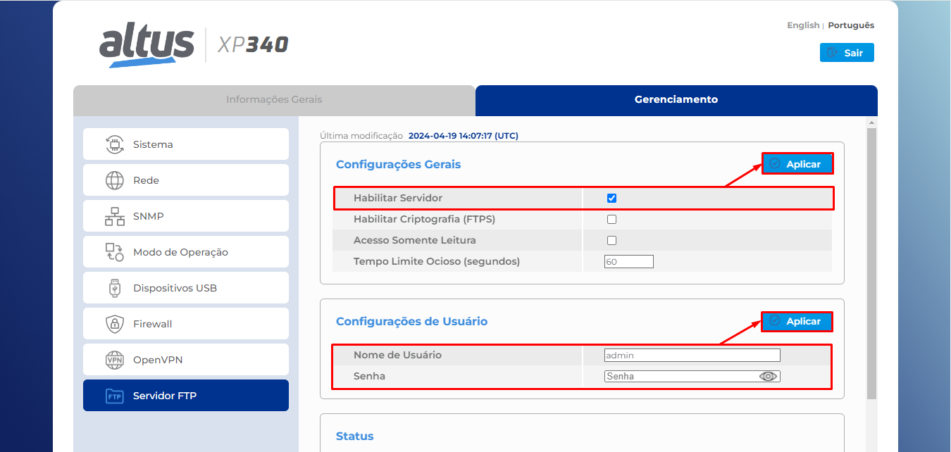 To configure the FTP server, simply enter the IP address of your PLC in your browser and access its WebPage. There, you will find a settings menu. Go to "FTP Server", then check the option "Enable Server" and then click "Apply". Then, enter a username and a password, click on "Apply". In this case, "admin" was used as username and password.