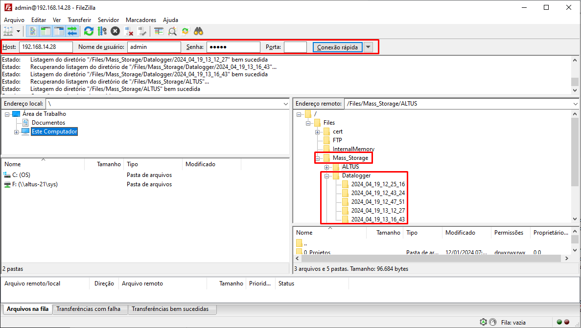 Finally, click on "Quick Connect". A list of files will be displayed. The Datalogger data will be recorded on the PLC's external memory, represented by the folder "Mass_Storage".