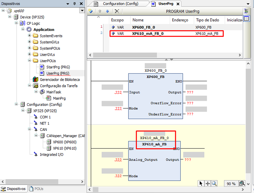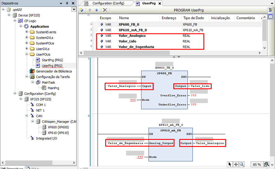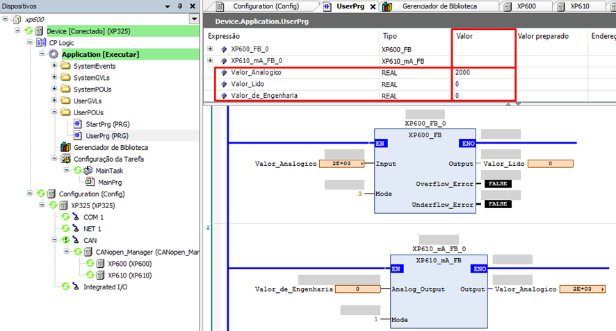 In the example, we use the variables “Valor_Analogico” in the “input” of XP600_FB so that the inputs read the values that will be generated by the outputs, “Valor_Lido” which is the value converted by the XP600 function block, and “Valor_de_Engenharia” which is the value to be written in the software and converted by the XP610 function block.