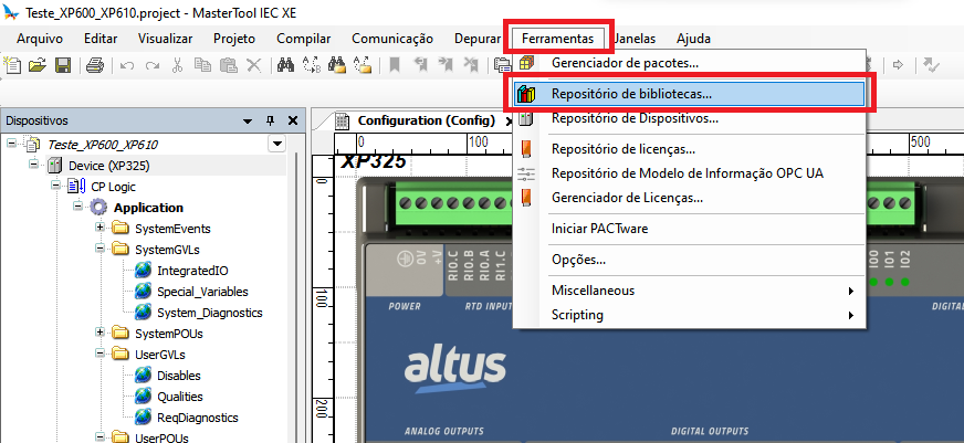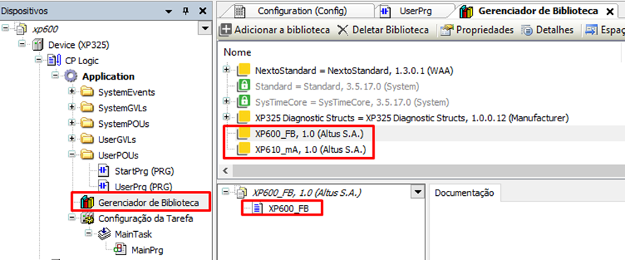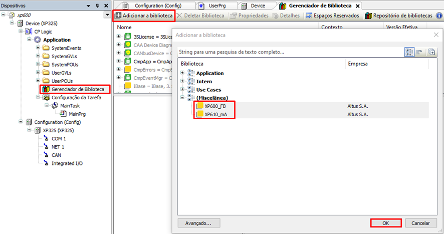 To use the Function Blocks, you need to add the libraries you installed in the “2.1. Inserting expansion modules in MasterTool” step. To do this, at the root of the project open the “Library Manager”, go to “Add Library” and in the “(Miscellaneous)” tab select the desired Function Blocks and click “OK”.