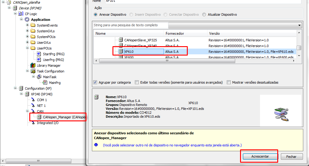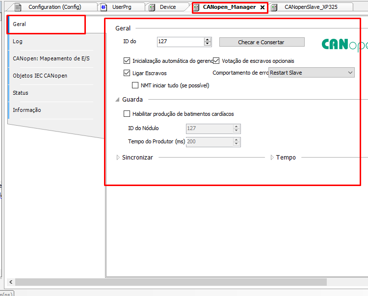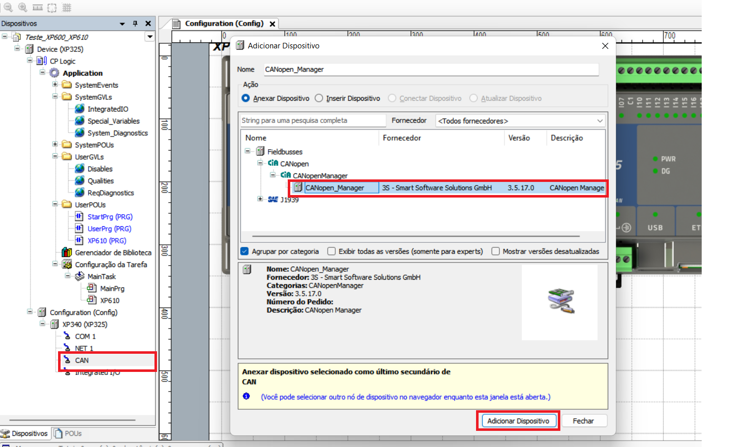Initially, following the path "Fieldbusses" --> "CANopen" --> "CANopenManeger", add the Manager, which will be the function of the PLC.