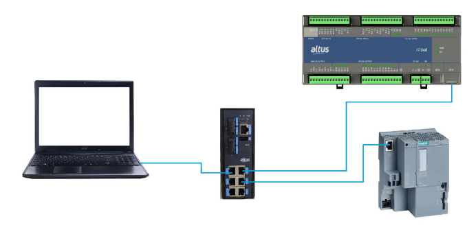 In the architecture of this tutorial, the Ethernet port of the XP340 CPU and the Siemens ET200SP ProfiNet CPU were connected to an Altus switch (ET5-0802). In addition, the computer that will be monitoring the communication will also be connected to this switch via the NX9202 cable.