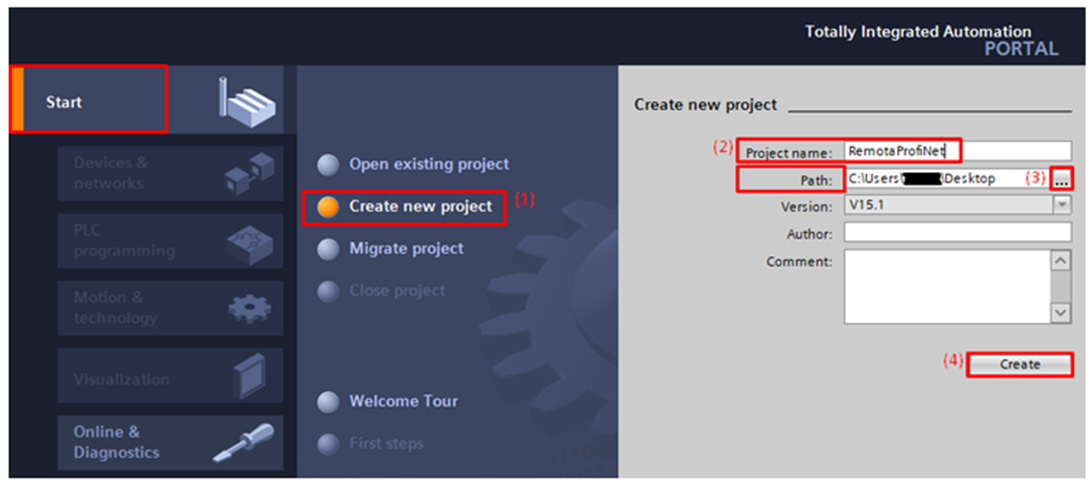 The CPU's GSDML file is developed in Siemens' TIA Portal software. When opening the software, select Create new project (1), set a name for the project in Project name (2), select the location where the project will be saved by clicking the three-dot icon in the Path (3) field and click Create (4).