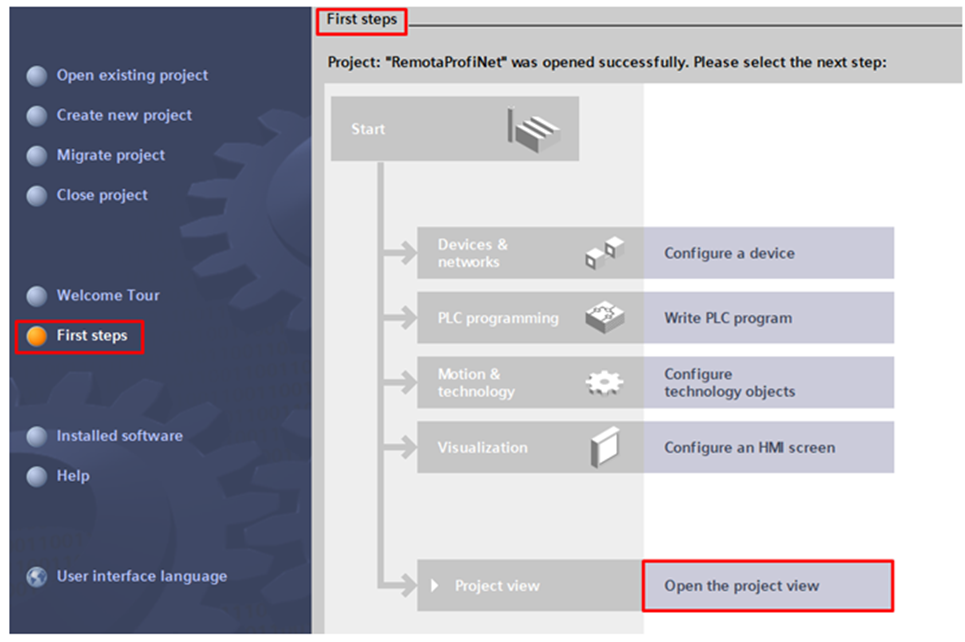 The First steps window will open on the right side of the software. Click on Open the project view.