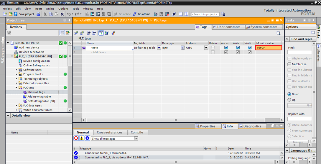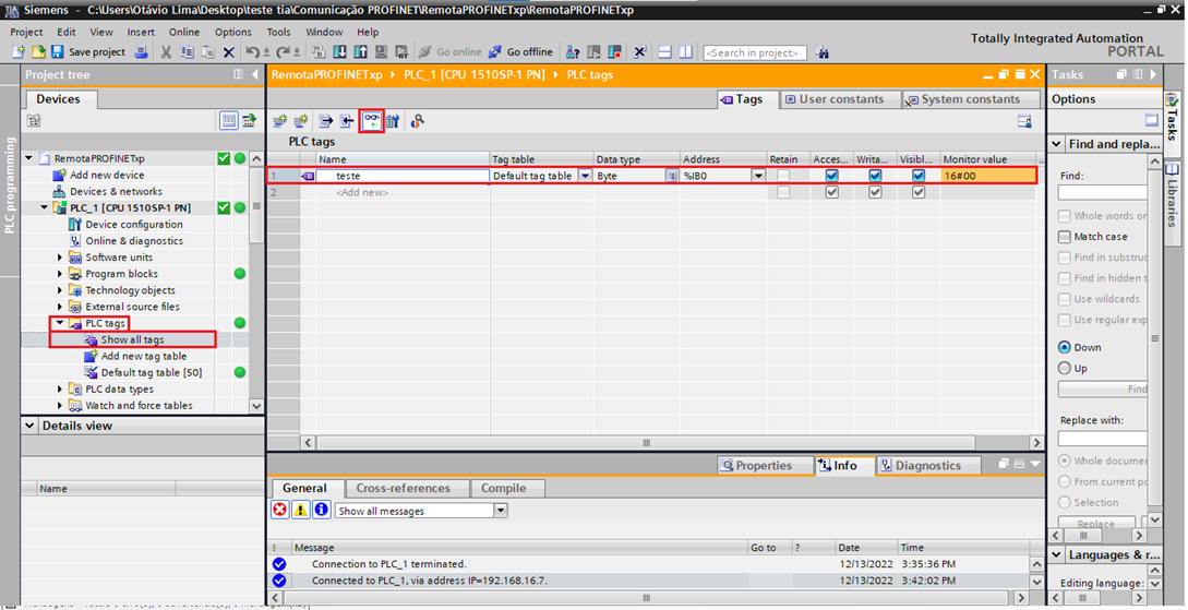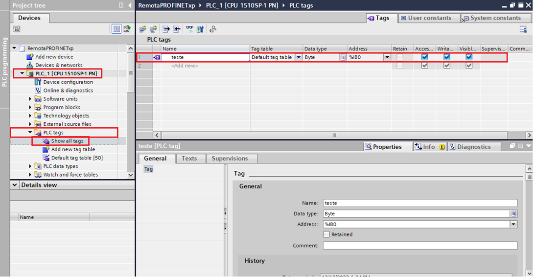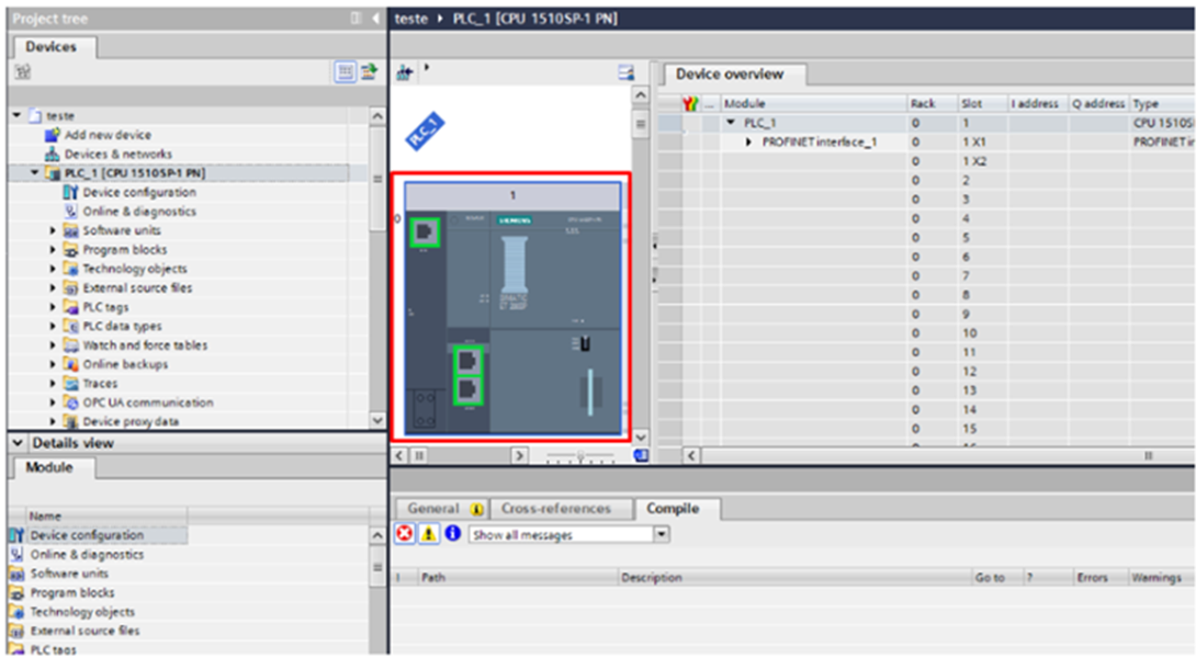 The CPU will be loaded into the project. After this step, a test TAG will be created to later observe the communication taking place.