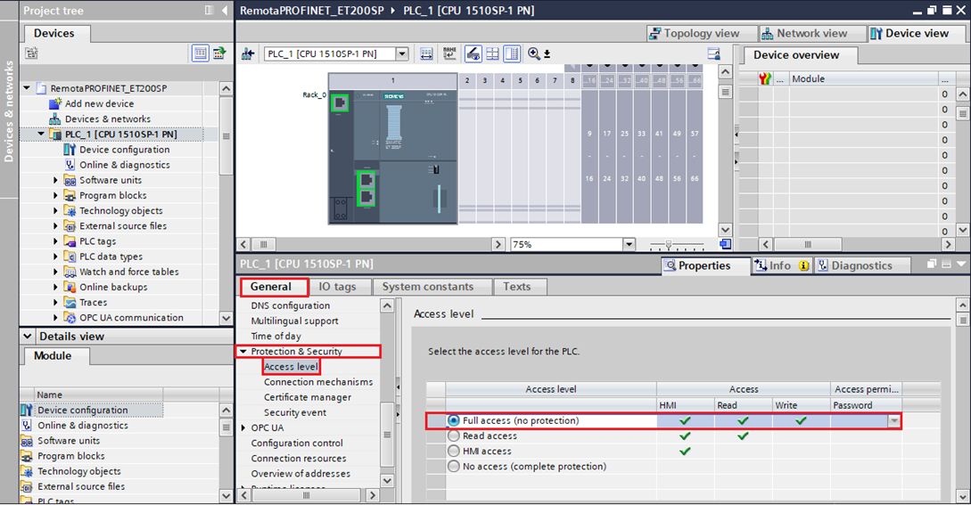 In the General tab (at the bottom of the software), select Protection & Security and enable full access to the CPU in the Access Level field.
