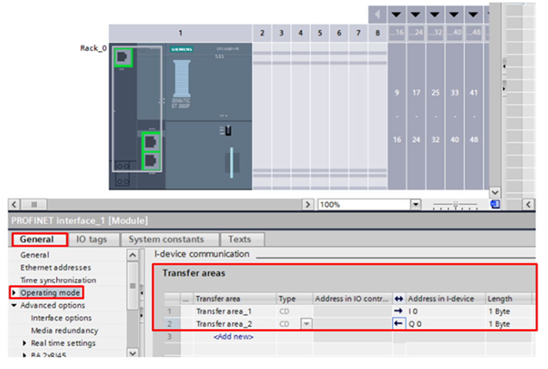 In the PNIO I/O Mapping tab, you can find the memory areas allocated for communication with the device (corresponding to the Transfer area fields in TIA Portal).