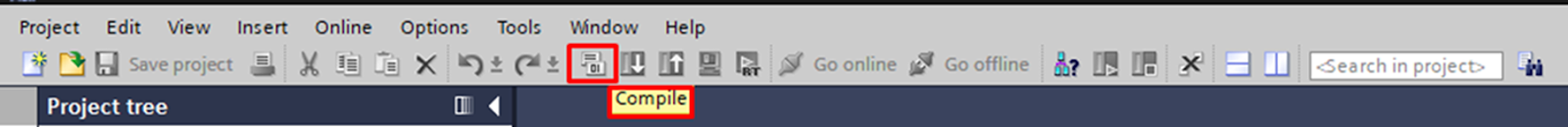 After configuring the CPU, save the project and then, in the top bar of the software, click the Compile icon to compile the project.