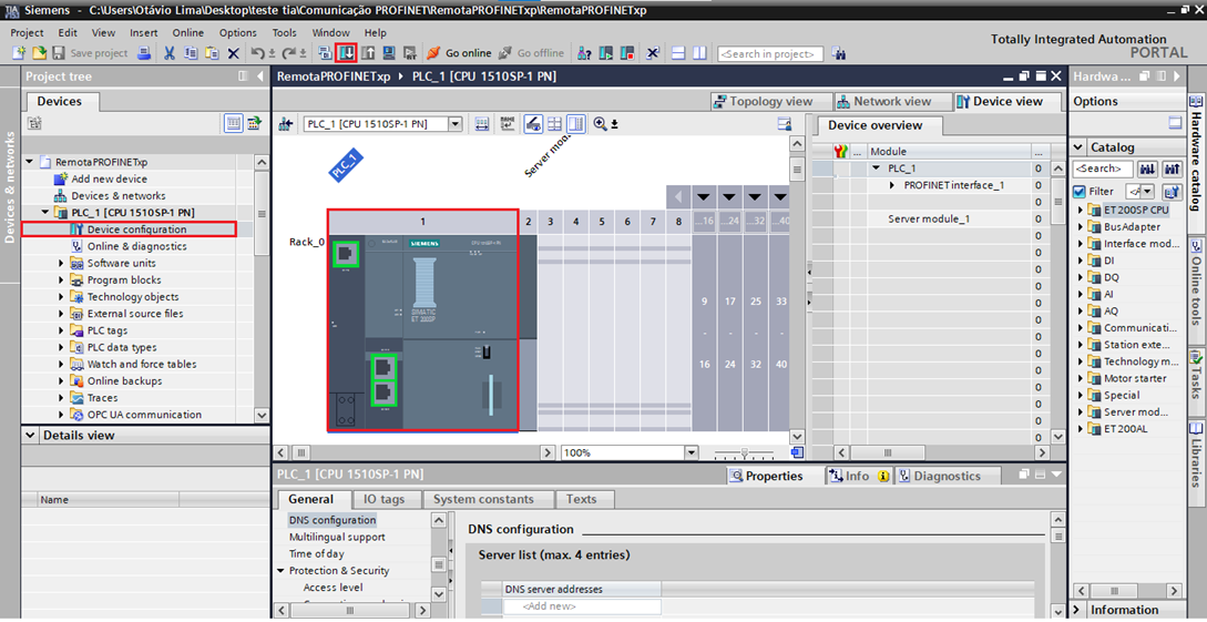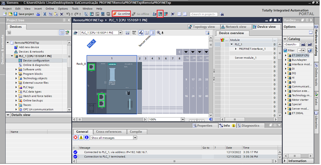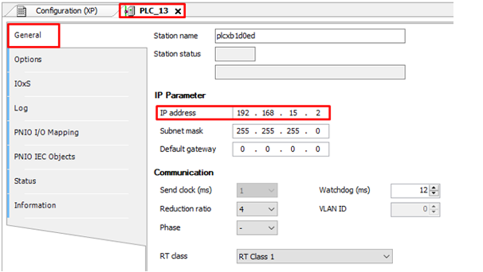 By double-clicking on the Siemens CPU (PLC_13) in the project tree, you can access its settings. In the IP Address field of the General tab of the CPU settings, you must configure the device address on the ProfiNet network (the same IP address configured in the TIA Portal software).