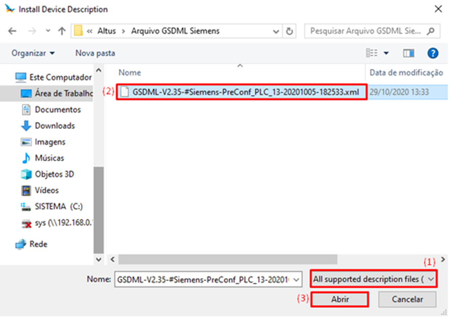 The Install Device Description window will open. With the file type selected as All supported description files (1), find and select the developed GSDML file (section 2.1. of this tutorial) (2) and click Open (3).