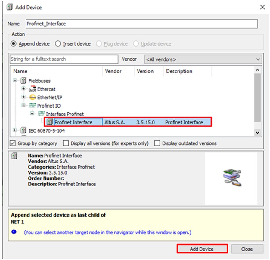 The Add Device window will open. Follow the path: Fieldbuses -> Profinet IO -> Profinet Interface, select Profinet Interface and click Add Device.
