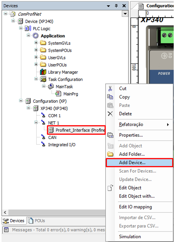 Right-click on the Profinet_Interface device (it will be below NET1) and click on Add Device.