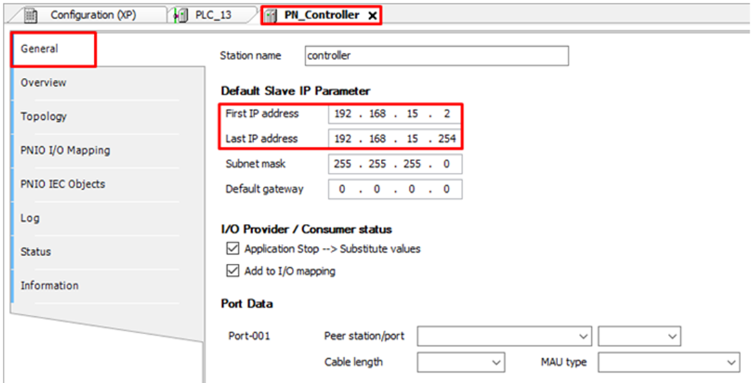 In the General tab of PN_Controller settings, you must configure the initial address and the final address of the devices on the ProfiNet network through the fields First IP address and Last IP address, respectively.