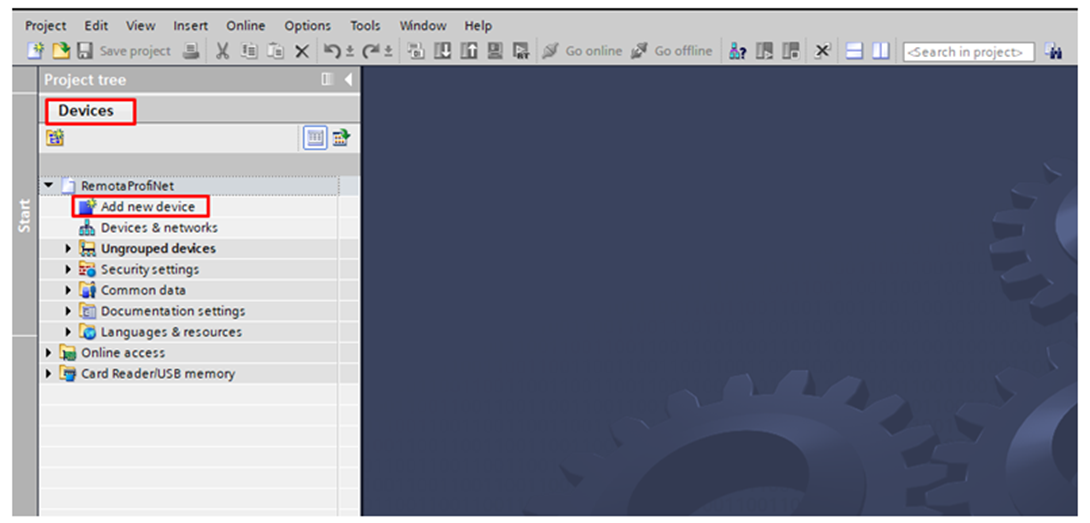 The project will be started. In the Devices tab of the project tree, double-click on Add new device to add the CPU to the project.