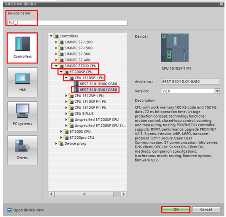 The Add new device window will open. Select Controllers and then select the controller you are using. In this tutorial, the ET200 SP 1510SP-1 PN CPU is being used, so follow the path: SIMATIC ET200 CPU -> ET 200SP CPU -> CPU 1510SP-1 PN, select 6ES7 510-1DJ01-0AB0, give a name to the device in the Device name field and click OK.