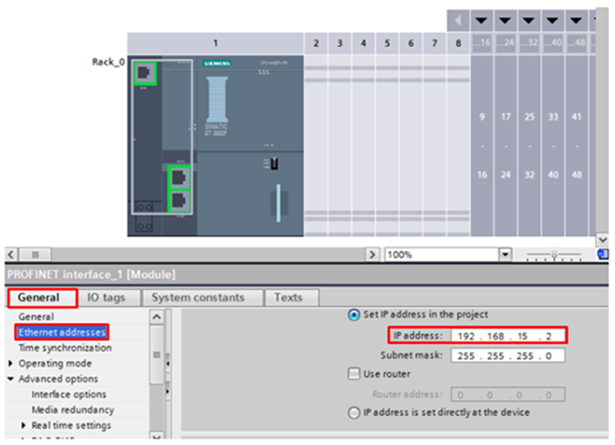 In the General (at the bottom of the software), select Ethernet addresses and set the CPU's IP address in the IP address field. In this tutorial, the address 192.168.15.2. was used.