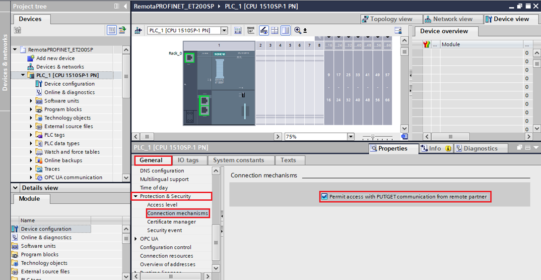 In the General tab (at the bottom of the software), select Protection & Security and enable permission for external access by other equipment to the CPU in the Connection mechanisms field.