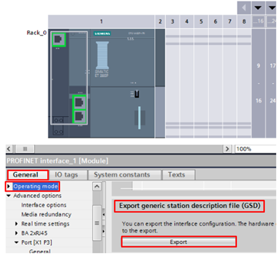 After compiling the project and if there are no errors, go back to the General tab, select Operating mode, locate the option Export generic station description file (GSD) and click Export.