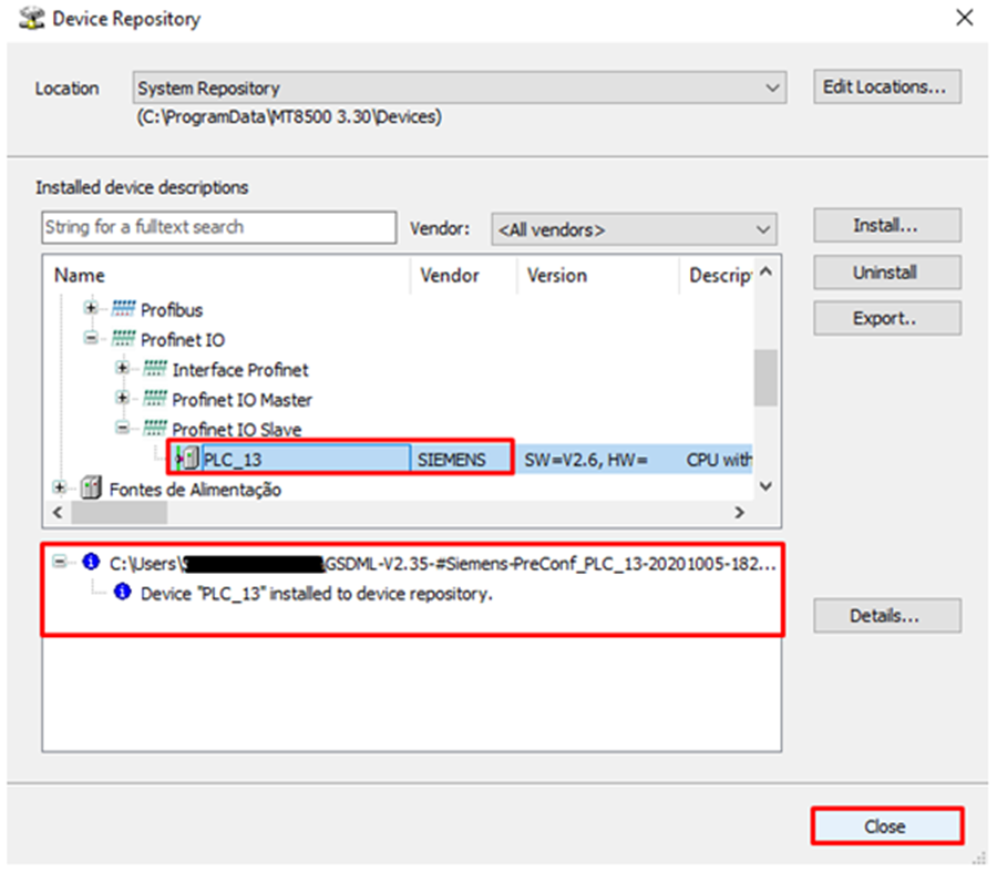 The GSDML file will be installed. At the end, click Close to close the window.