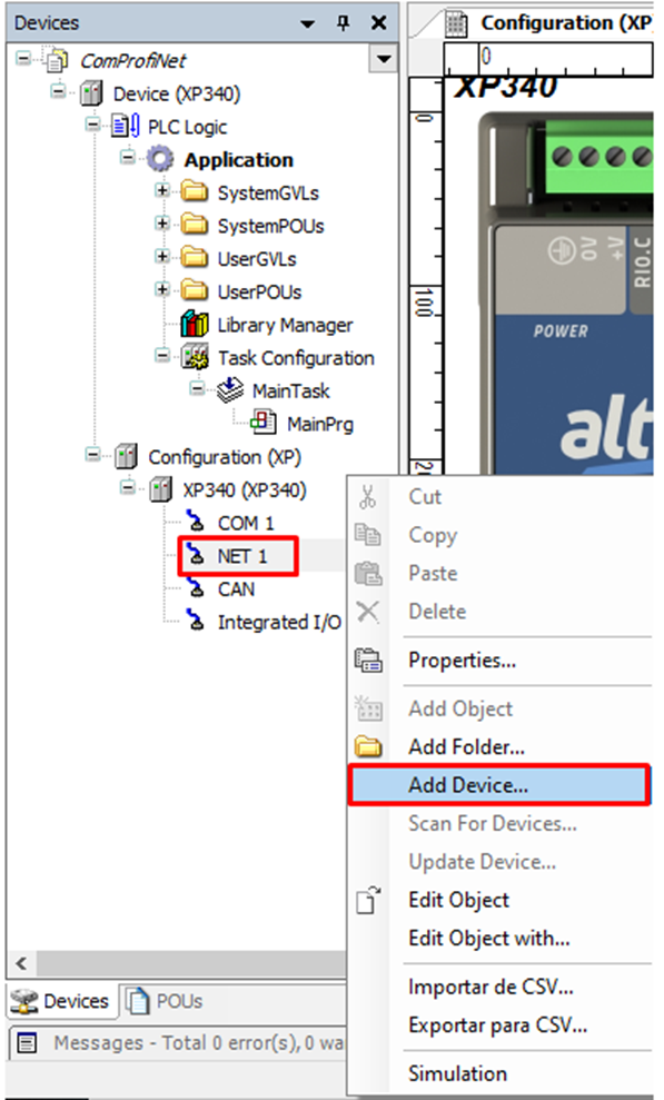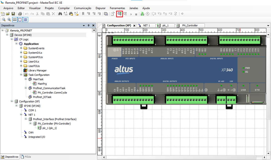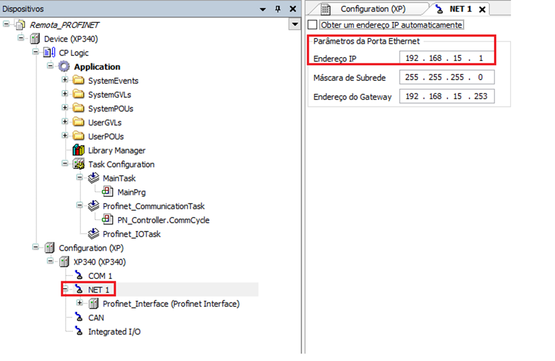 It should be emphasized that the CPU that will be the master in this communication must have an IP outside the range of IPs intended for the ProfiNet network slave devices. In this project, the XP340 was configured with the IP found in the NET1 tab, as shown in the image: