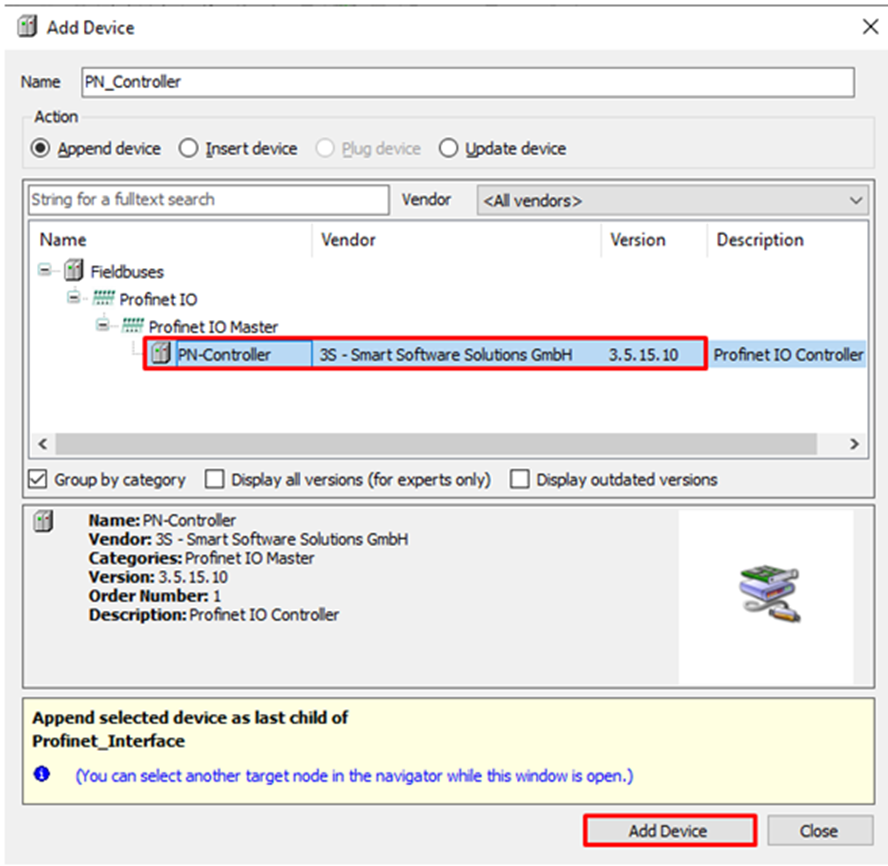 The device PN_Controller will be added below Profinet_Interface. Click Close to close the Add Device window.