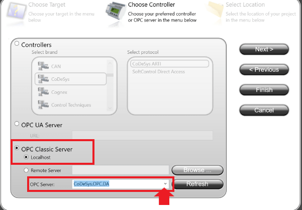 In the next window select OPC Classic Server under OPC Server, click the arrow on the side to open the drop-down list and select the option CoDeSys.OPC.DA. Click Next, in the next screen name the project and choose where you want to save it, then click Finish.