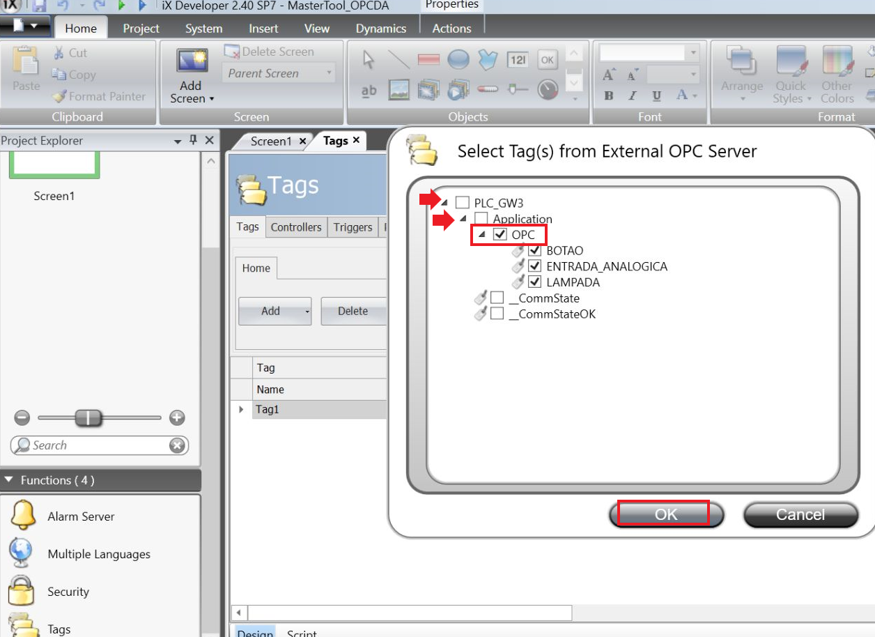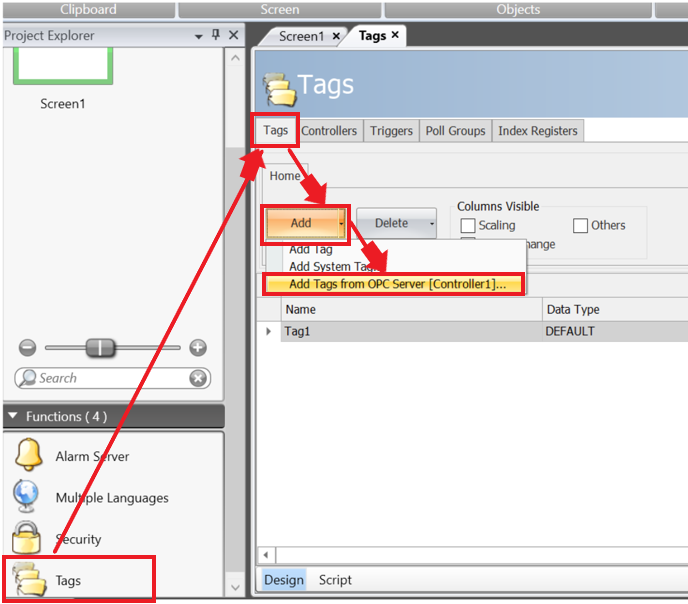 When the project opens, click on Tags in the lower left corner of the screen, in the Tags tab click the Add arrow to open the drop-down list, select the option Add Tags from OPC Server (Controller1)