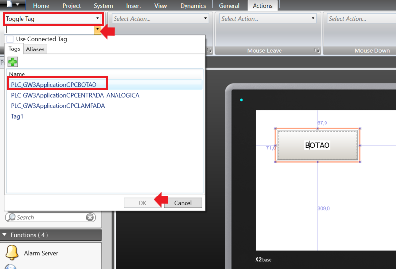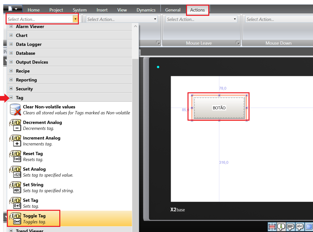 To link the tag to the button, select the button, click on the Action tab at the top of the taskbar, in "Click" click on Select Action >> Tag >> Toggle Tag