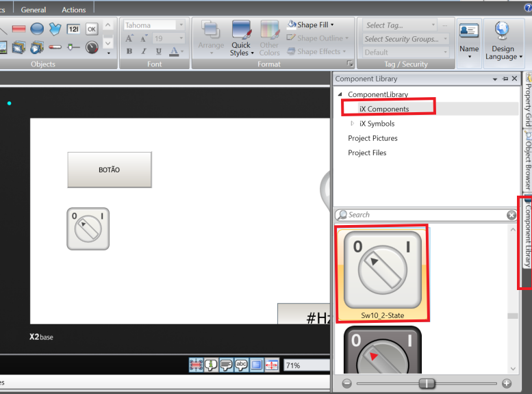 To better visualize the button state change, we will also add an ON/OFF switch. Go back to Home in the taskbar at the top left. Open the component library and click on one of the ON/OFF switches and drag it to the screen.