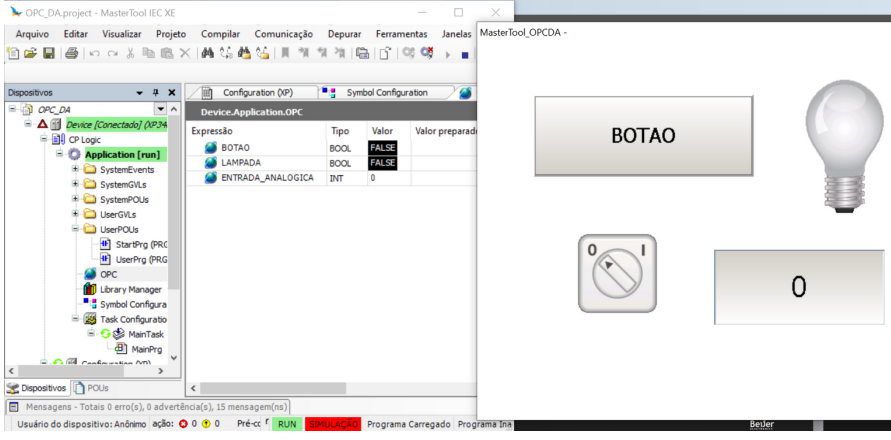 Click Run (green arrow in the upper left corner of the screen) or press F5 to start the simulation of the HMI screen. Split the simulation screen with the MasterTool screen so you can monitor the variables.