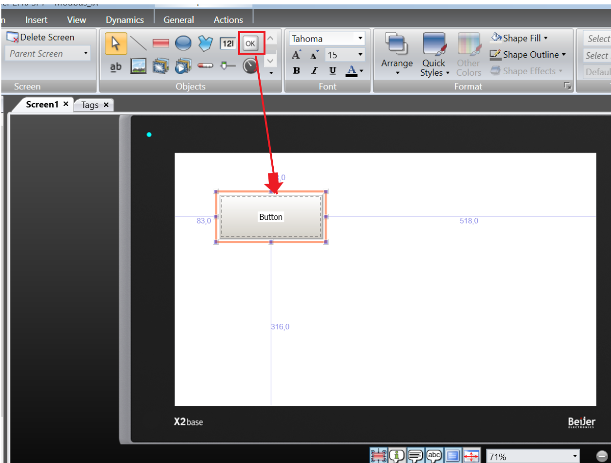 To create the simulation screen, double-click on Screen to open the HMI screen, then click on Button, the symbol with "OK" inside, and click on the HMI screen (the button size can be changed as desired).