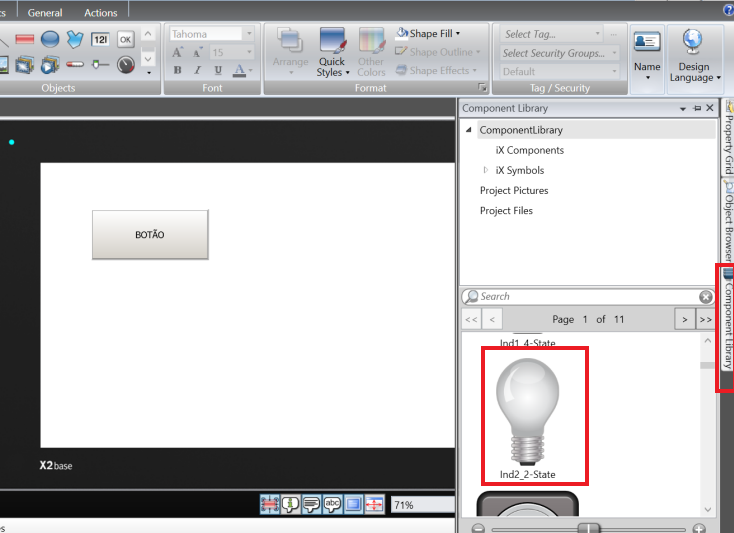 Open the component library again and now add the lamp by clicking once on it and dragging it to the HMI screen. This lamp will be configured exactly as the ON/OFF switch was, only changing the selected tag.