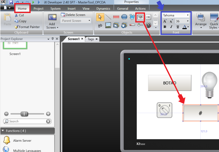 In Home, click on the analog display represented by a box with "123" and click on the HMI screen. The blue rectangle in the image beside shows where you can change the font and font size that will appear on the display.