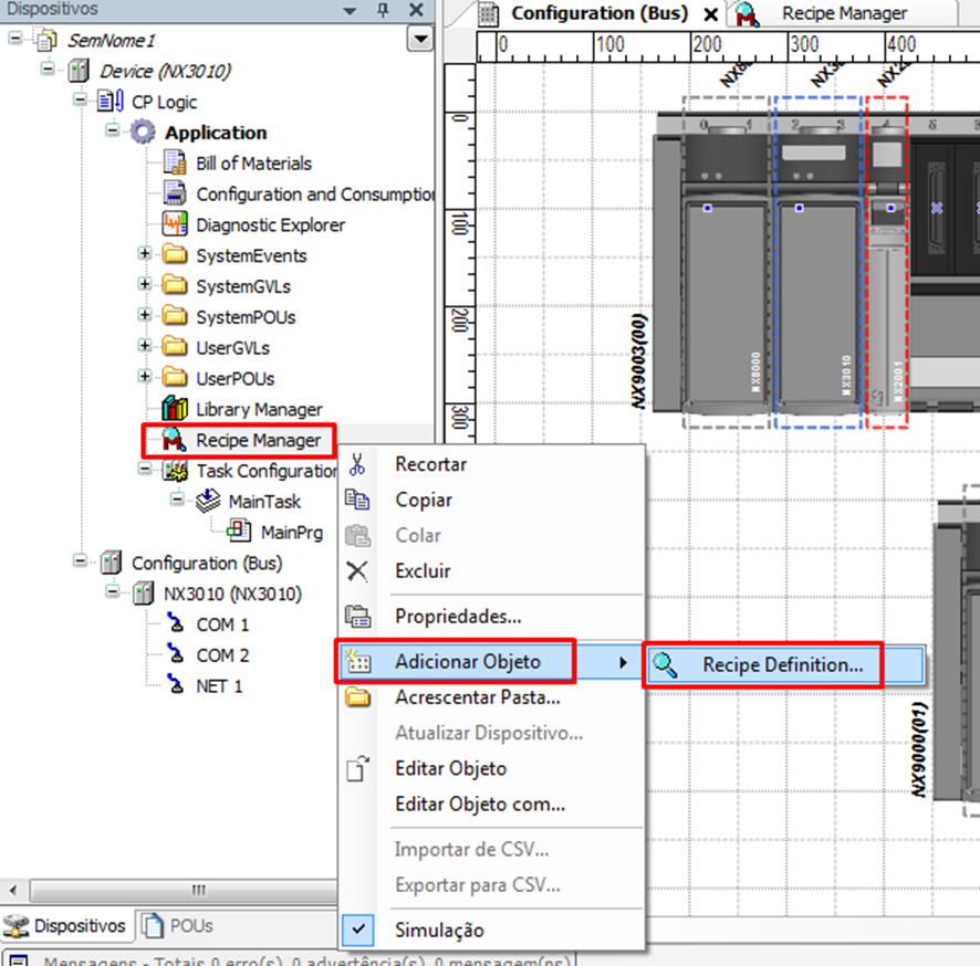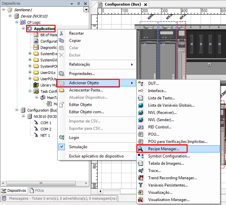 To add the recipe manager, right-click on “Application” in the device tree, go to the “Add Object” option, and add the “Recipe Manager”.