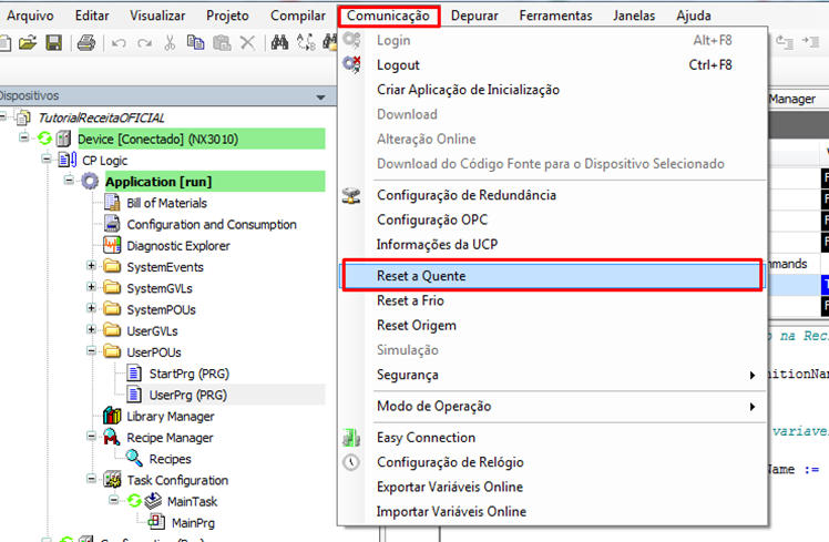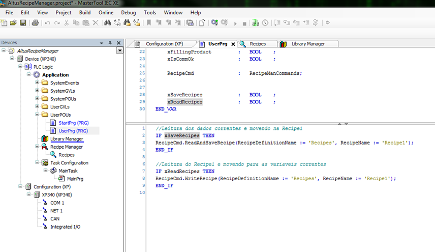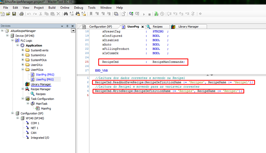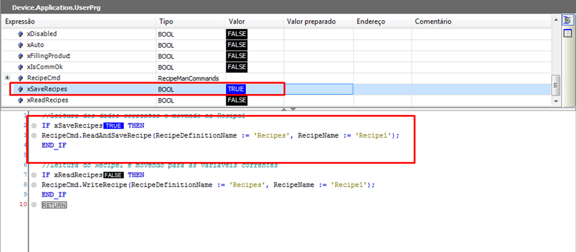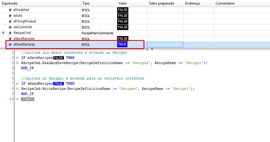 Within this "RecipeManComands" structure, there are several commands that can be used and explored later, but the ones we will use are “.WriteRecipe” for writing the recipe to variables and “ReadAndSaveRecipe” for reading the variable values. Both commands include the parameters “RecipeDefinitionName” and “RecipeName” which, in this tutorial, will be “Recipes” and “Recipe1”, respectively.