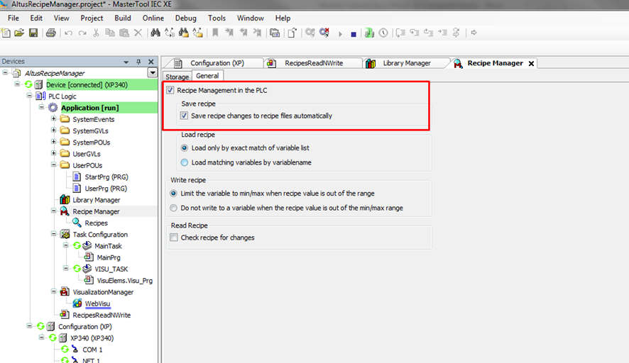 Within the properties of the Recipe Manager, check the options “Recipe management in the PLC” and “Save recipe changes to recipes files automatically”.