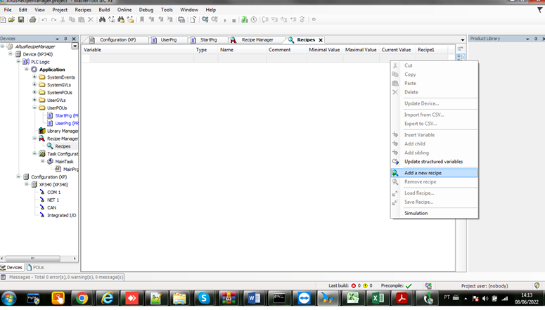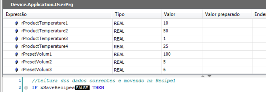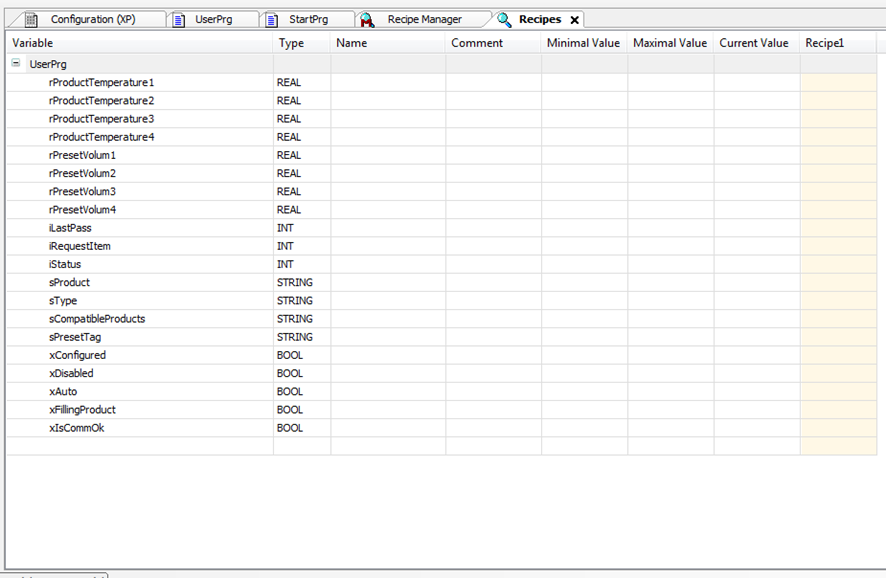 First, we must insert the recipe manager, create a recipe group in Mastertool, and add a column (recipe) where the variables will be stored.