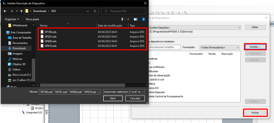 The .eds files for the expansion modules are available in the downloads center on the Altus website, under the "software" category, with the series "Nexto Xpress" and function "I/O Modules".