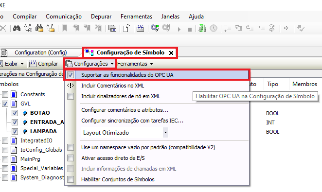 After adding the Symbol Configuration >> in settings next to compile, check the option Support for OPC UA features.