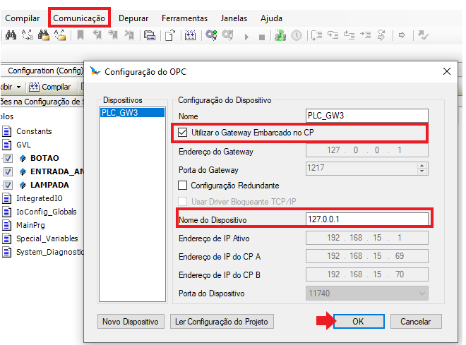 Click on Communication >> OPC Configuration. Make sure the active IP is your PLC's IP and change the device port to 11740. In Gateway address, enter your PLC's address as well and the Gateway port should be 4840. Select the option to use gateway on the CP. After making these changes, click OK. Finally, in communication, log in to your PLC.