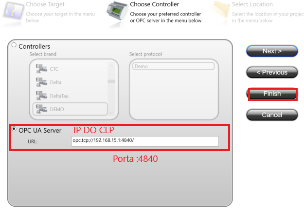 IP of your controller in the URL option and at the end of the IP add the OPC port :4840 Click Next, in the next screen name the project and choose where you want to save it, after that click Finish