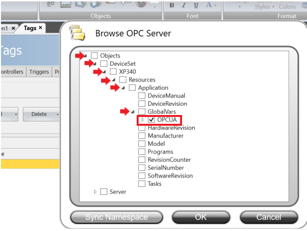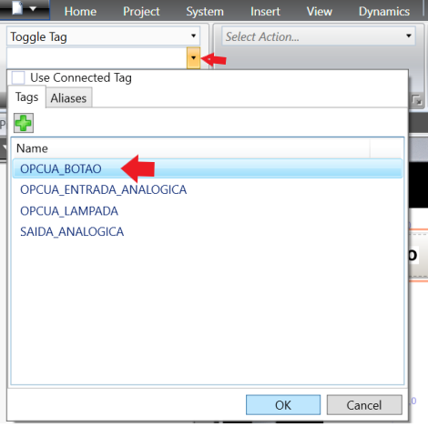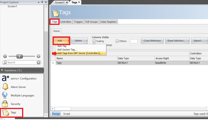Next, in Tags, at the bottom left corner of the screen, click on the tags tab and add the variables that were used in the MasterTool project by clicking add tags from OPC Server.