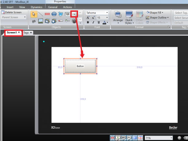 To create the simulation screen, double-click on Screen to open the HMI screen, then click on Button (the symbol with "OK" inside) and click on the HMI screen (the button size can be changed as desired)