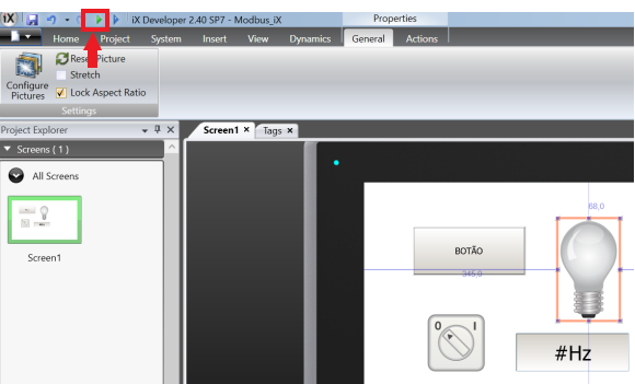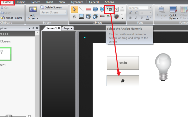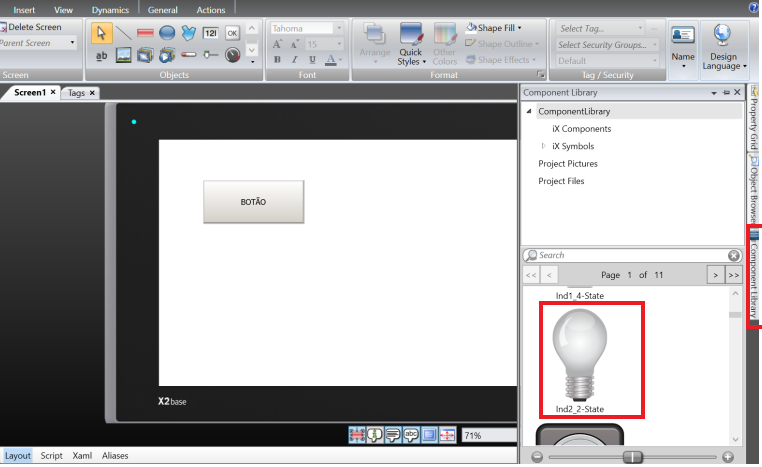Open the component library again and now add the lamp by clicking once on it and dragging it to the HMI screen. This Lamp will be configured exactly as the ON/OFF switch was, only changing the selected tag to the LAMPADA tag.
