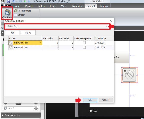 Select the switch, click on General >> Configure Pictures. The image configuration tab will appear, in select tag type the variable name or click the arrow next to see the tags present in the project and select. To finish, click OK.