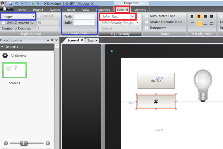 To link the tag to the display, select it, in the General tab >> select tag (you can type the tag name or click to open the drop-down window with the project's tags and select the analog tag). The blue rectangles show where you can add suffix and prefix as well as define the type of number that will appear on the display