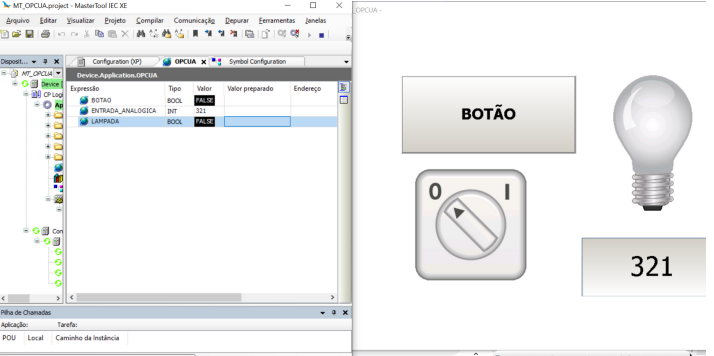 Click Run (green arrow in the upper left corner of the screen) or press F5 to start the HMI screen simulation. Split the simulation screen with the MasterTool screen so you can monitor the variables.