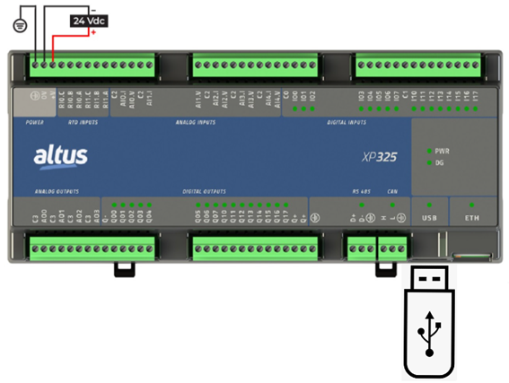 In the architecture of this tutorial, a USB Flash Drive containing the file with the project to be downloaded will be connected to the USB port of the XP325.