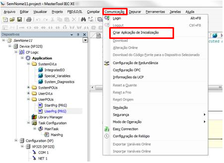 First, with the USB Flash Drive formatted to FAT32 and connected to the computer where the project is located, open it in the MasterTool IEC XE software. In the Communication tab on the top bar of the software, click on Create Initialization Application.